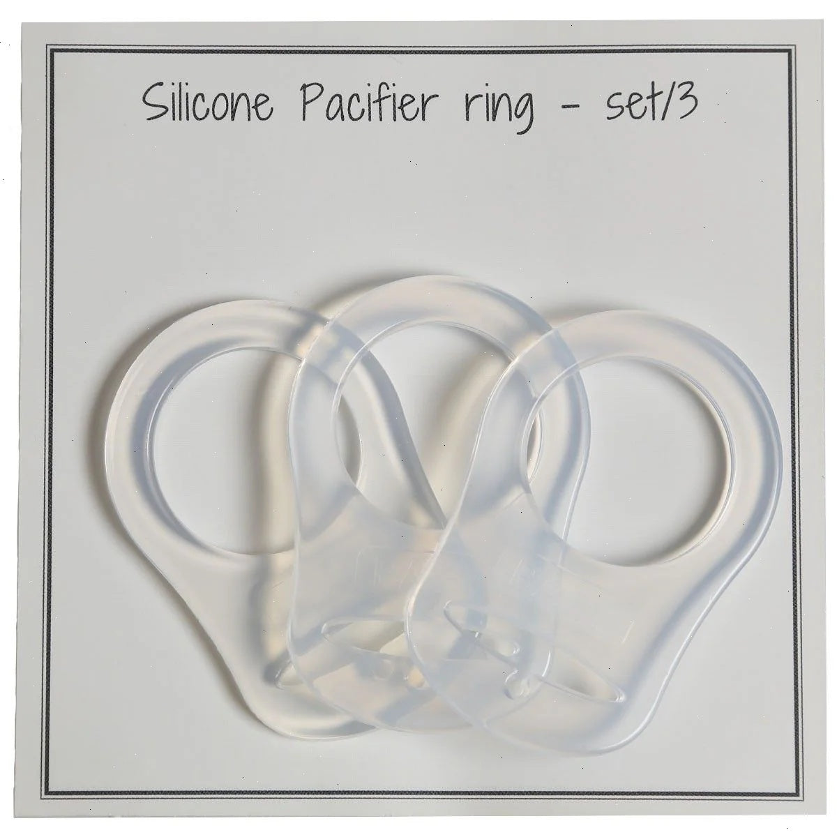 Silicone rings you can attach to your baby’s pacifier. Combine the ring with a crocheted chain/strap attached to, for example, a suspender clip. Attach the suspender clip to the baby’s clothes, and the baby will now always be able to reach the pacifier. Always choose a clip with vent holes for a pacifier chain!