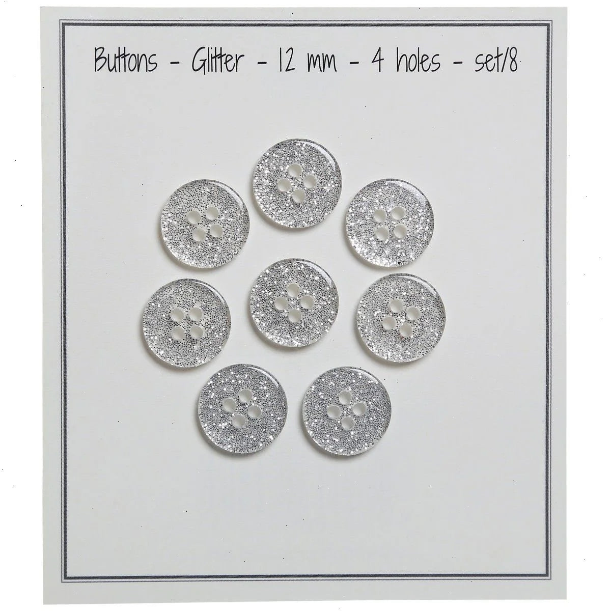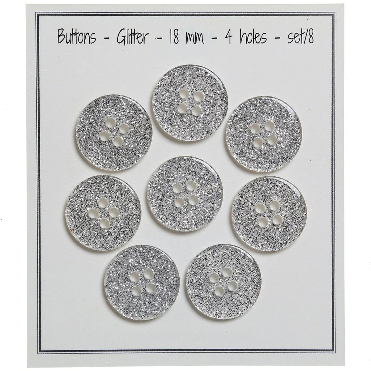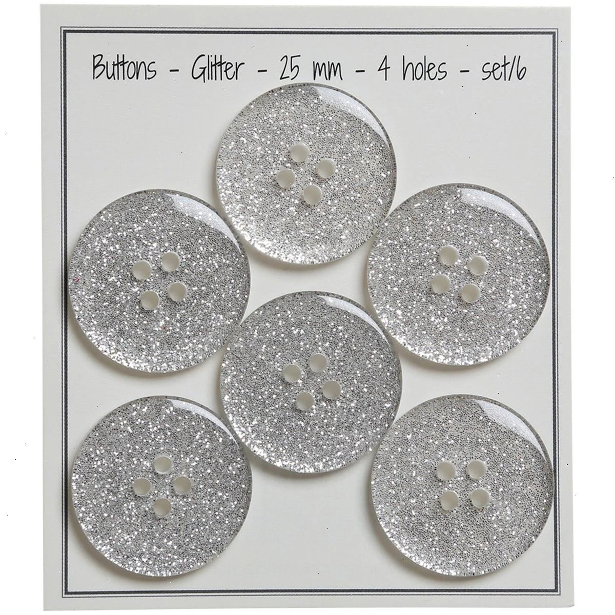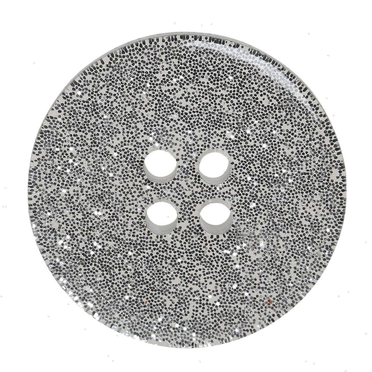 Beautiful, sparkly silver buttons with four holes for attachment. Perfect for the cute cardigan that needs that last exquisite detail. The glitter buttons come in different sizes and are perfect for big and small projects.