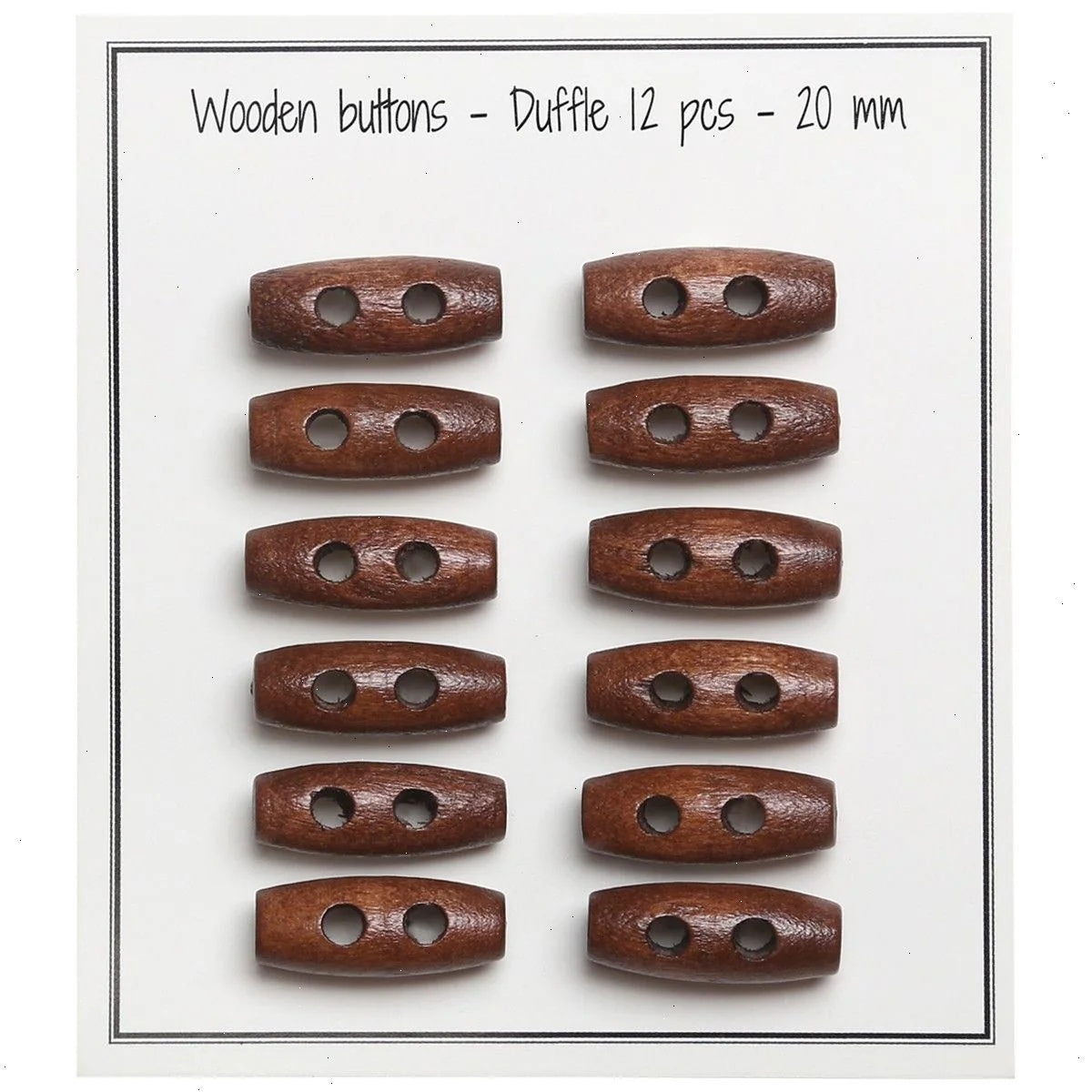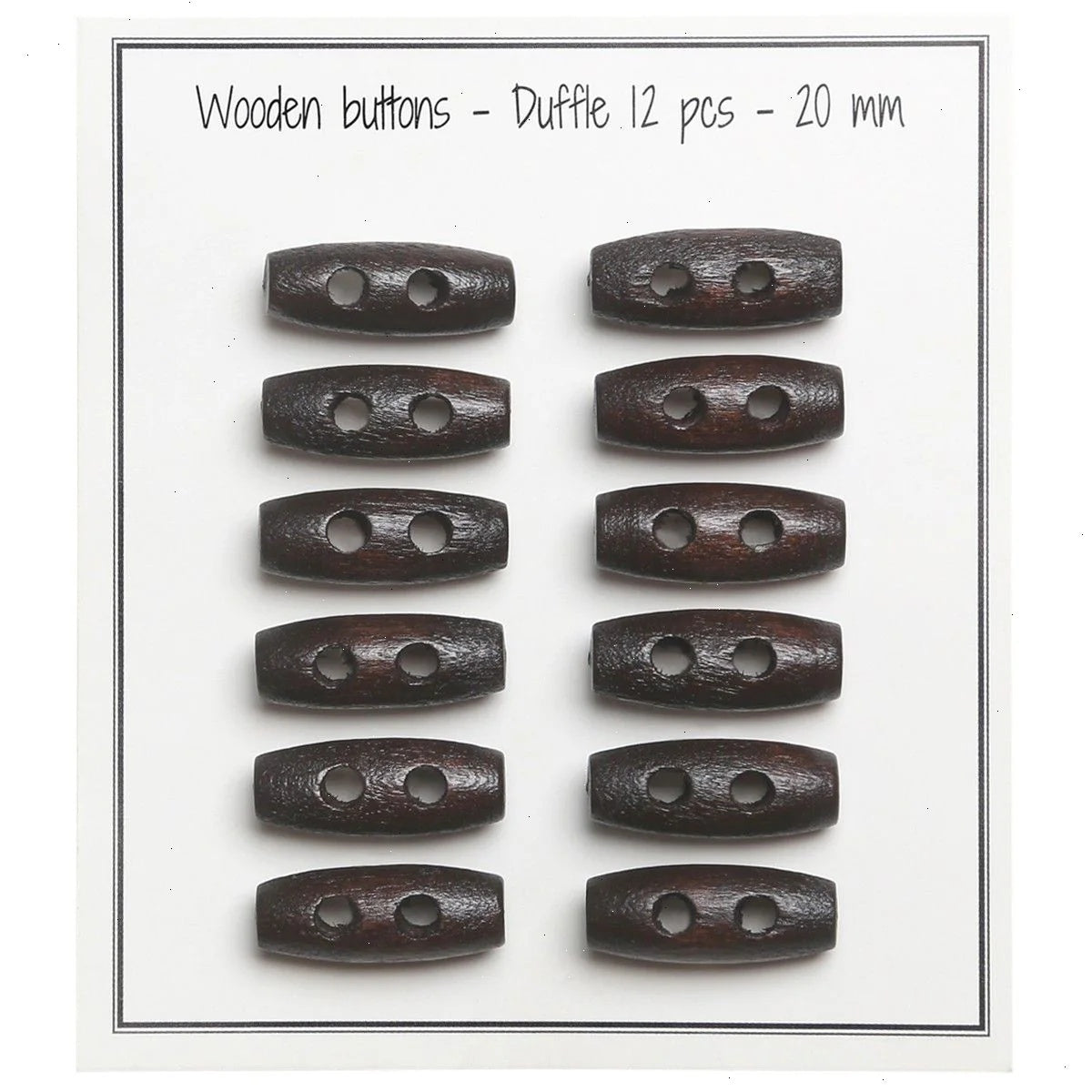 This pack contains 12 small, oblong wooden buttons. The buttons are only 20 mm wide and can be used for all kinds of different projects. The buttons have 2 holes and come in several shades.