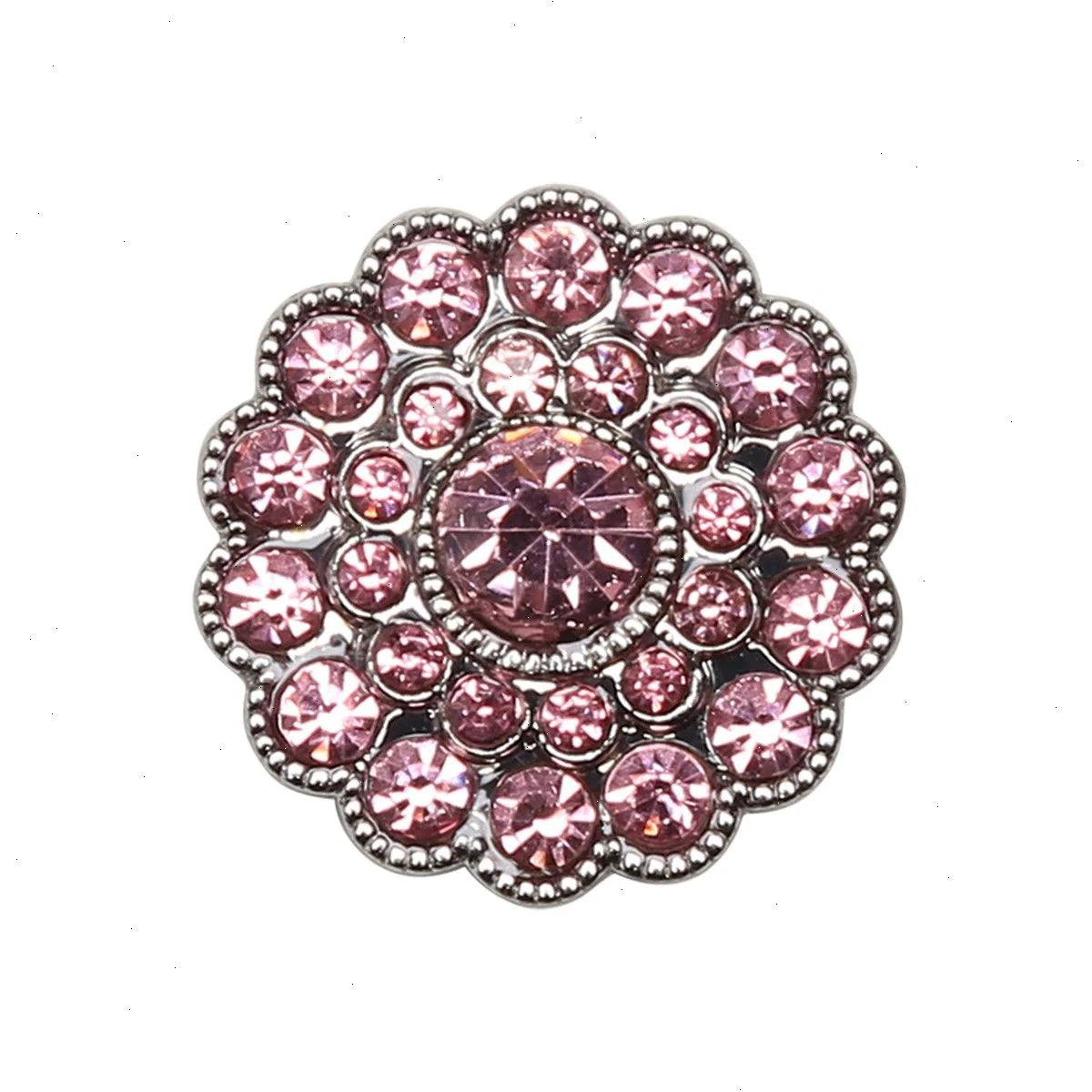 The buttons have two rows of smaller, pink stones around a larger pink stone in the middle.