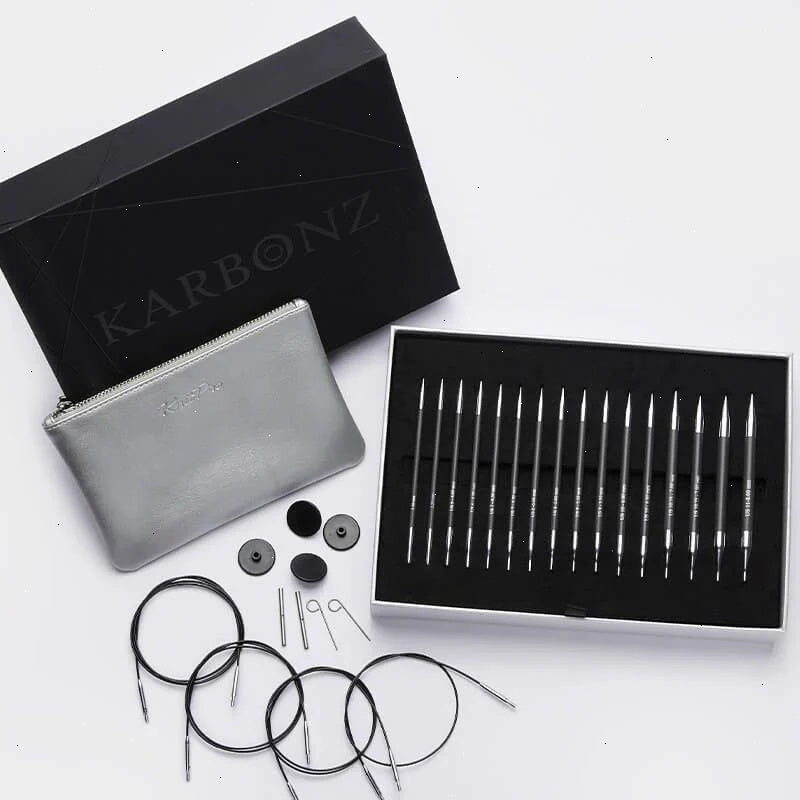 This set of Karbonz Interchangeable Circular Needles is the perfect blend of strength and elegance. That makes it the perfect match for knitters of all skill levels. Crafted of lightweight and super strong carbon fiber, 8 sets of sleek interchangeable needle tips are laser marked with sizes. The beautifully honed tips ensure smooth knitting with any and all yarns.